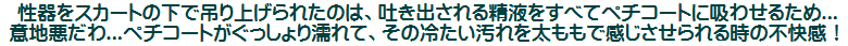 スカートの中で射精が始まりました。ペチコートの下で赤いロープできっちりと股縄をかけられ、股割れパンティから性器を剥き出しにされた恥ずかしい状態で