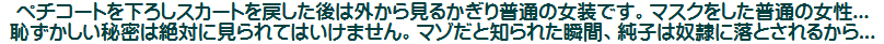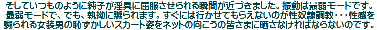 スカートの奥で淫靡な震動が純子を責め苛んでいます。急所に嵌められた責め具ですが、その振動は最弱モード...ああ...ご主人さまの意地悪!...ひと思いに...