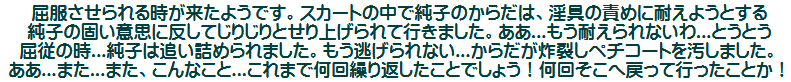 ああ...どうぞ、ひと思いに決着をつけて欲しい...性感を嬲られてよがる姿を晒しものにされるのはとてもつらいから...スカートの中の陰惨・陰湿な苛めはもう堪忍...