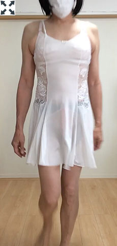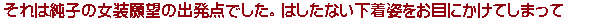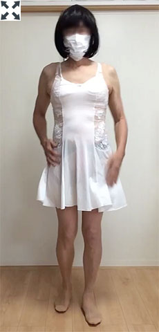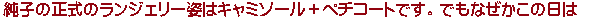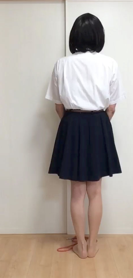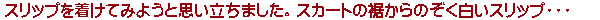 生脚に見えますが、明色系のストッキングをガーターベルトで吊っています。スリップを透けてベルト部分が見えています。パンティは許されていない純子のからだです...
