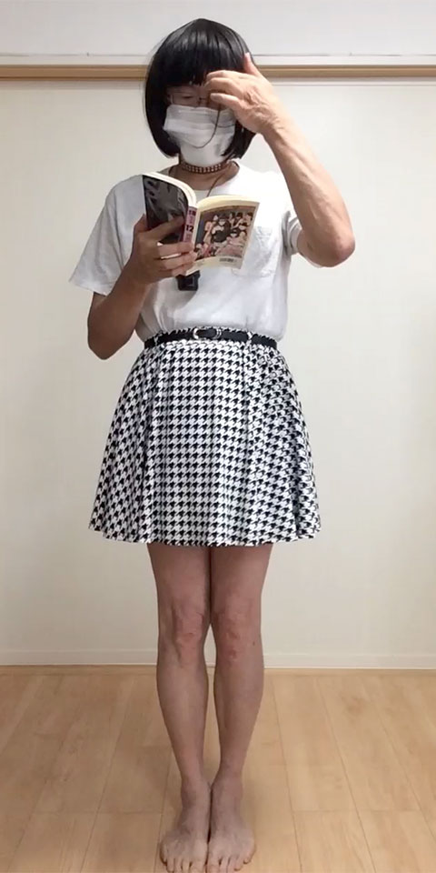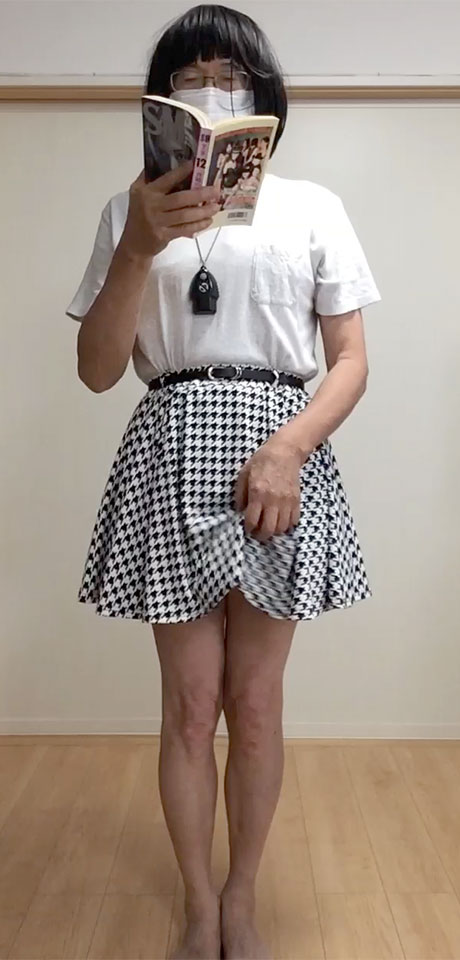 男モードでスカート姿になりました。ほんとうはこういう感じで日常生活を送りたいのです。必ずしもこんなに短いスカートでなくてもいいけれど、暑い日はやっぱり...