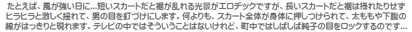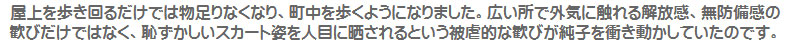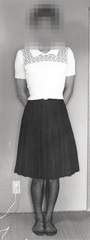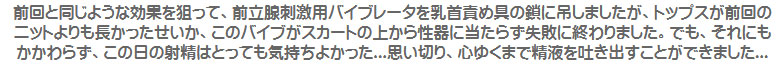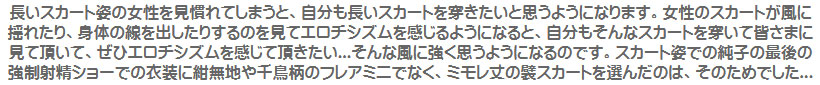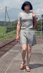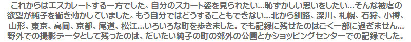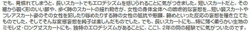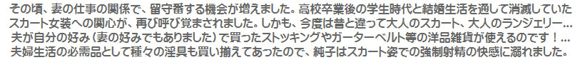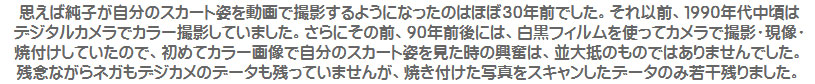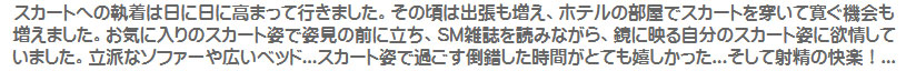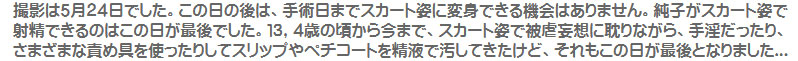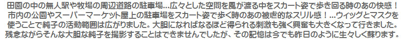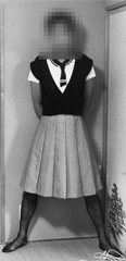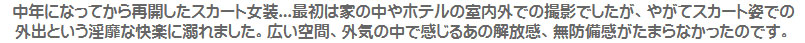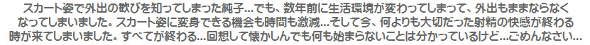 ![]() 前回と同じ効果を狙って、前立腺刺激用バイブレータを乳首責め具の鎖に吊しましたが、うまく行きませんでした... ![]() スカート姿に変身できるのがこれで最後というわけではないと信じているけど、今までと同じように楽しめるのは今日が最後...少し感傷的になっています。 ![]() ![]() スカート姿での最後の射精でペチコートを汚す純子です...ストッキングはガーターベルトで吊っています。 ![]() ![]() スカート姿での最後の射精が終わりました。ああ...ペチコートが濡れています。性器の興奮はまだ続いています... ![]() ![]() 左のフレアスカートは妻が町中で見かけて買ったもの、真ん中の紺色24本プリーツスカートと右の12枚はぎフレアスカートは銀座ゲルランです。 ![]() ![]() この頃はハイソックスの時も明色系のストッキングをガーターベルトで吊っていました。生脚ということはありませんでした。ブラジャーもまだ着けていない頃です。 ![]() ![]() ホテルではほぼいつもギンガムチェックのプリーツミニスカート(中)でした。他にはグレー無地のプリーツミニ(左)、千鳥柄プリーツミニ(右)など。 この他パステルブルーのフレアーミニスカート(下右)も着用しましたが、家から持ち出せるスカートは限られてものにならざるを得ませんでした。 ![]() 最初は外出と言ってもホテルの屋上でした。スカート姿で風に吹かれる...その歓びを知りました。左2枚は同じホテルで半年の違いです。靴も違います。 ![]() スカート姿で町中を歩き回ったり、自動販売機でジュースを買ったり...誰に見られているか分からないというスリル感が純子のマゾヒズムを強烈に刺激しました。 上左は東京都文京区本郷の桜蔭高校前、中は東京ドーム前の外堀通りをスカート姿で歩く純子です。昼間には白山通りや専大通り、神保町交差点などを 歩いていました。右は北海道釧路市末広町の自動販売機コーナーです。直前には幣舞橋まで往復しています。でも、撮影は限られた場所でのみ可能でした。 ![]() ![]() いろいろなスカートで郊外や町中を歩きました。でも、赤いスカートだけは外出の時に穿けませんでした。目立ってしまって女装がバレるのが怖かったから… ![]() ![]() 短いスカートや長いスカート...結局、その時の流行りのスカートを穿くのが一番安全なように思いました。ボルドー色のような目立つスカートは穿けませんでしたが... ![]() ![]() ![]() 買い物から帰ってすぐに袋から出して穿いてみました。生脚です。 ![]() ミニスカートのイメージ(ネットから) ![]() 短いスカート姿を見ると、変態女装マゾの純子でもなぜか嗜虐的になってしまいます。たとえスカートを穿いているのが同性でも... ![]() ロングスカートのイメージ(ネットから) ![]() ロング丈襞スカートが風を受けて、女性の太ももや下腹部のラインがはっきりと出ています。 これはスカートの商品カタログ写真ですが、町中でもこのような光景をしばしば目撃することが あります。実は、太ももの線が出るということはスカートの生地次第で、短くてもあり得るのです。 ![]() ![]() ![]() ![]() ![]() ![]() ![]() ![]() |