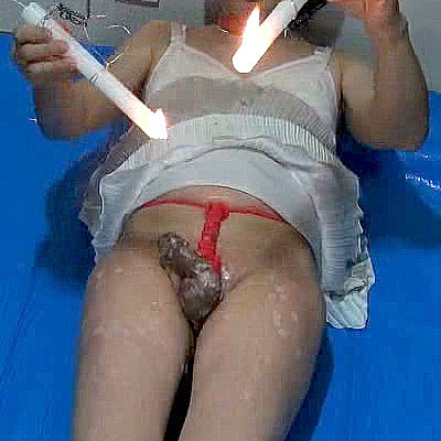 熱蝋拷問 鞭打ちは一旦停止だ。先刻の電気拷問のように、俺たちは高原が苦しむ様子を見て楽しむことにしよう、と一ノ瀬が言って始めたのが熱蝋拷問でした。床に仰向けに横たえられた僕の上に白い大きな蠟燭が2本、細い鎖で吊り下げられました。水平より少し頭部が下がった状態です。さっきと同じように澤村の手が僕のスカートを整えてくれました。ろうそくはそのスカートの上にぶら下がっているのです。何をされるのか...僕はすぐ分かりました。昔、ある男性からきつい調教を受けた時のクライマックスがこの責めだったから。と、一ノ瀬の手が僕のスカートの裾にかかりました。「署名する気になったか、高原?...ふん、もっといたぶられたいんだな?...いい覚悟だ、高原」と言いながら、一ノ瀬は僕のスカートを捲り上げ始めました。重ねたペチコートも1枚ずつ念入りに捲り上げ、最後には太ももも性器も剥き出しにされてしまいました。そして今、一ノ瀬の右手には、真新しい白くて太い蠟燭が握られています。もう一方の手は仰向けにされた僕の剥き出しの脚を...ええ、膝から始まって徐々に膝から上へあがってふともも、そして下腹部をいやらしく撫で回すのでした。最後に僕の性器を弄びながら一ノ瀬が言いました。