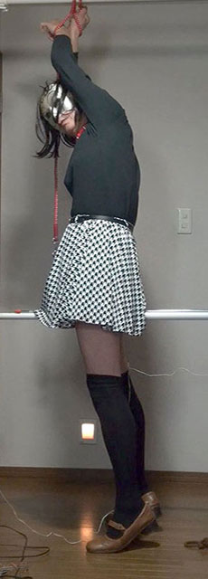 一ノ瀬と澤村が部屋から出て、最後に裕子が出て行くとき、吊られて拷問を受けている僕の横を通り、一瞬目が会いました。そこには憐れみと蔑みのニュアンスがありました。頬と唇には冷笑が...そして誰もいなくなった部屋で、この電気装置の拷問が延々と続きました。ああ、酷い...無慈悲で無残な拷問...誰も手を下さないのに、つま先立ちの苦しさを避けようとすれば、電気ショックがスカートの中で性器と会陰部、太ももに機械的、自動的に加えられるのです。疲れることを知らず、ひたすら製作者の一ノ瀬と澤村の目論見どおり正確に、無情に、そして終わることなく・・・