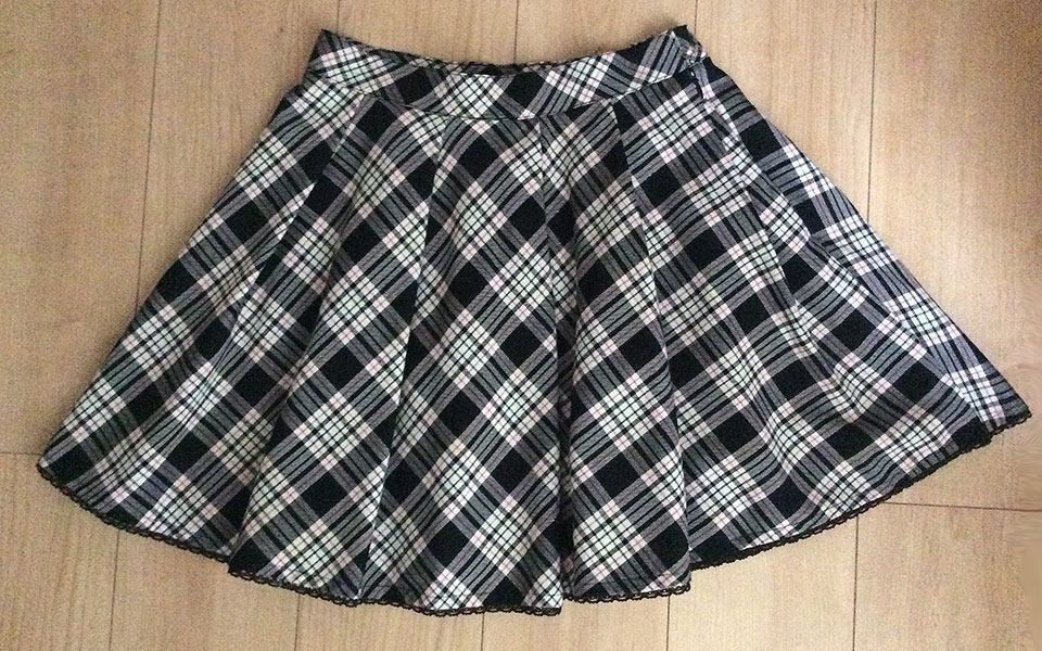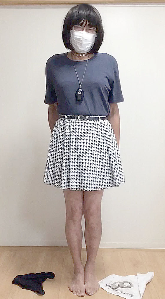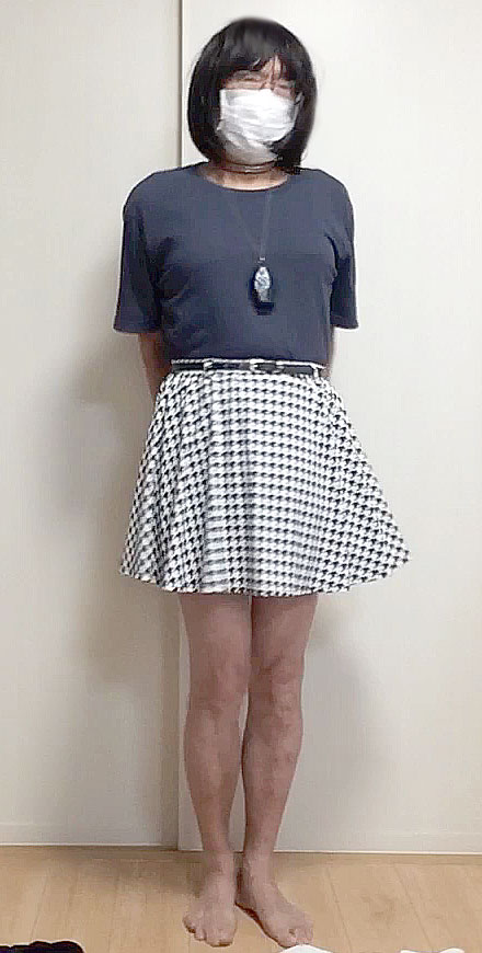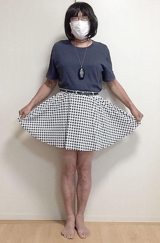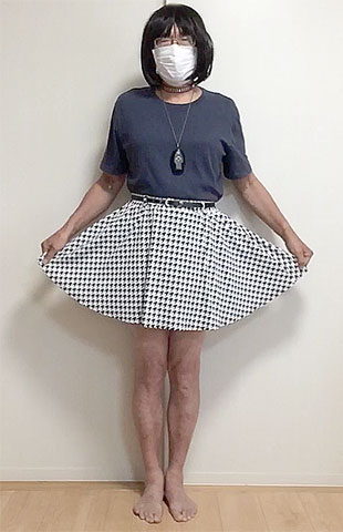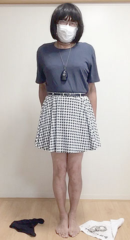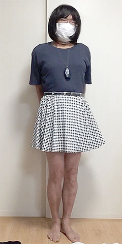 妻に指定されたのと同じスタイルです。とっても短い千鳥柄のフレアスカート+生脚+半袖Tシャツという、拷問で辱められるための服装! |