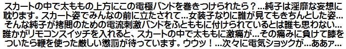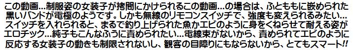 後ろ手に縛り上げられた制服姿の女装子が電気ショックと鞭で拷問にかけられて...太ももを集中的に責められる彼女の反応がとてもエロチックです。