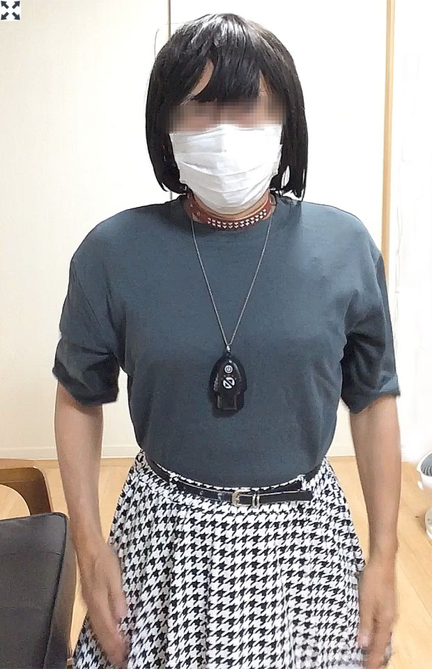 (夫の女装によって妻も得るものがありました。)ポロシャツの下はランニングシャツだけです。