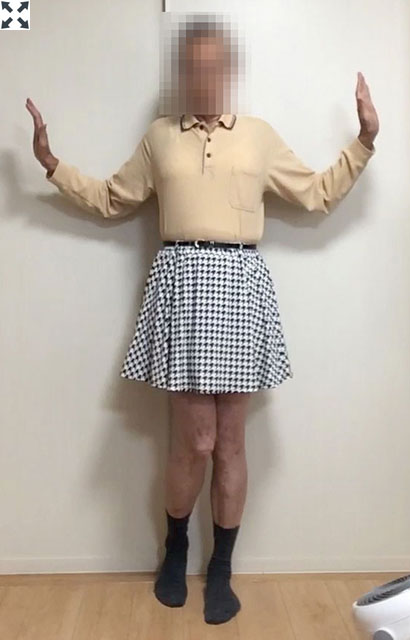 9年前と同じポーズを取る純子です。同じスカート、同じポロシャツですが、あの時とは下着がちがいます。