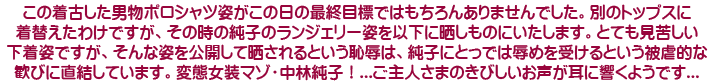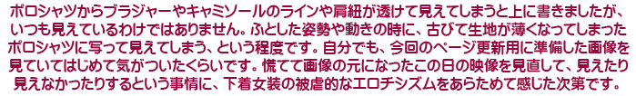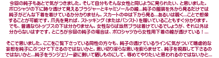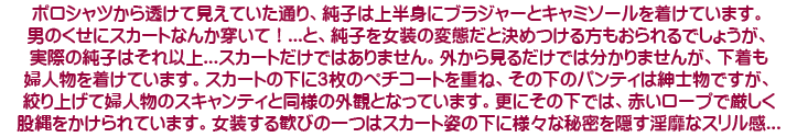 (夫の女装によって妻も得るものがありました。)ポロシャツの下はランニングシャツだけです。