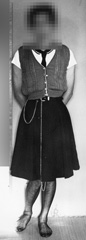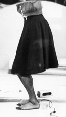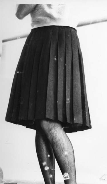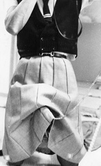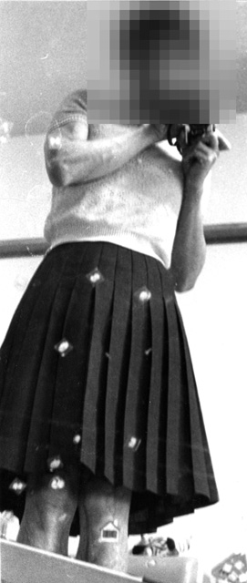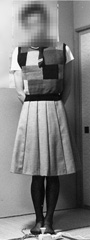 | この頃はまだ脛毛や太腿の毛が今よりかなり濃かったのです。でも剃るという発想はありませんでした。できるだけ黒いストッキングを履くことで、 目立たなくしていました。上のスカートは銀座ゲルランです。白地に黒の細かい千鳥格子が入っています。この当時、銀座ゲルランは純子の お気に入りでした。色は白地に紺です。トップスのセーラー風ニットとお揃いのベストもゲルランです。この頃は靴もありませんでした。 ハイソックスも今ほどは一般的ではなかったので履くこともありませんでした。このスカート、残念ながら今はウエストが入りません... |