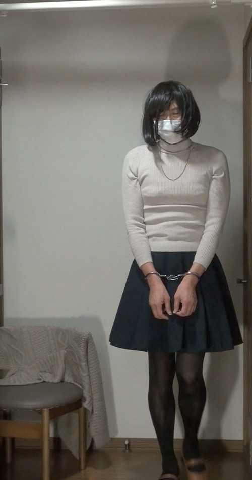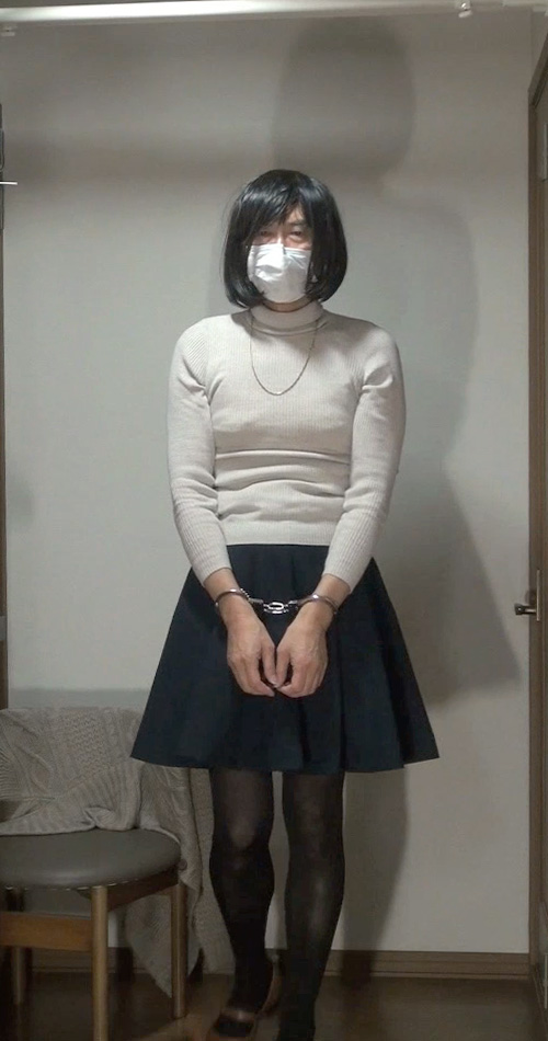 おい、こっちを見ろよ、○○!俺と目を合わせろ。どんな気持ちなんだ?スカート穿いて手錠かけられて。