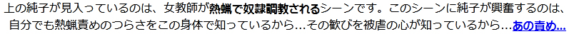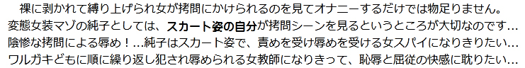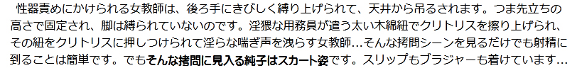 ![]() 生脚に見えますが、明色系のストッキングをガーターベルトで吊っています。スリップを透けてベルト部分が見えています。パンティは許されていない純子のからだです... [2020.06.02] ![]() ブラウスといっても紳士ものの半袖ワイシャツです...写真では分かりにくいですが、下着(ブラジャー、スリップ)が透けて見えるのが恥ずかしい... ![]() ![]() ![]() ![]() 掃除機は淫靡な遊び道具にも拷問器具にもなります。 ![]() 掃除機が性器を吸い込みます。スカートの上から...ペチコートの上から...手を離せばそのまま純子の体に吸いついて残るくらい...負けそうだったので中断しました... ![]() ![]() 読んでいたSM雑誌を忘れてパャRンの画面に見入る純子...熱蝋で責められる女教師の呻き声が純子を引きつけて止みません。ああ...純子も熱蝋で責められたい... ![]() 熱い蝋が柔肌に一滴落ちるたびにビクッと身体が反応して、同時に.呻き声が...喘ぎ声が...喉から絞り出されます。 ![]() ![]() 拷問は続きます。全裸で後ろ手に縛り上げられ、天井から吊るされた彼女の陰部が太紐で執拗に擦り上げられます。とてもつらい拷問...彼女は喘ぎながら許しを乞うのです。 女教師が屈辱をぐっと押し殺して男に許しを懇願する...そんな場面を見て、純子はスカートの下ですっかり高ぶっています。まだ性器責めの淫具も装着されていないのに... ![]() よく知られているのは女性同士のリンチ...ピンと張ったロープを全裸緊縛で跨がされ、尻を鞭打たれながら歩かされるという 無残な私刑です。ロープには所々に瘤が作ってあって、クリトリスが刺激されるという意地悪さ!でも、男にも同様の責めが ![]() ![]() ![]() ![]() 撮影範囲の外ですが、このあと性器からの分泌液で床を汚してしまいました。 汚したといっても透明なサラサラの液体...これは純子の淫具への屈服の証し・・・ ![]() ![]() スカートの中でもう助ェに熟れ切った純子のからだが淫具に迫り上げられ、そして追い詰められるのはあっという間のことでした。刺激のすべてが新鮮でした・・・ [2020.06.06] |